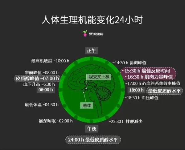 通過上面這張圖可以看出,人的體溫、血壓、睪酮等在一天之內都在不停變化,這就決定了肌肉力量和激素水平,在一天之內也會有很明顯的差異。