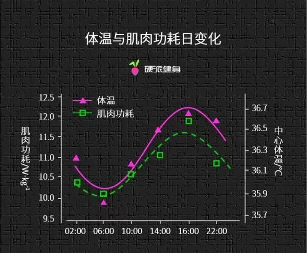 通過上述圖表我們可以看出,人體的體溫在 16:02的時候到達了最高點。這就相當于人在這個時間段內被動熱身,使肌肉的彈性組織增加了彈性,更加不容易斷裂。所以這個時間段訓練,受傷的幾率會比其他時候小很多。